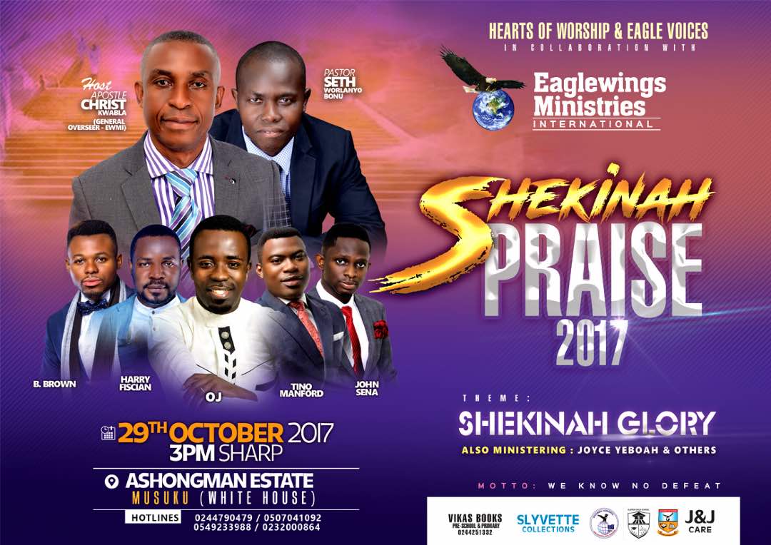 HEARTS OF WORSHIP and EAGLE VOICES in collaboration with EAGLEWINGS MINISTRIES INTERNATIONAL presents a testimony-yielding program dubbed 'SHEKINA PRAISE 2017' under the theme, 'SHEKINAH GLORY'.