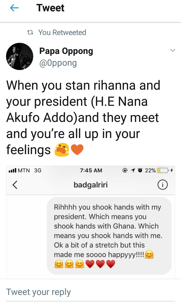 It appears that Rihanna was so moved by the President's comments that she responded to Oppong's message and said that the President was inspiring.Â